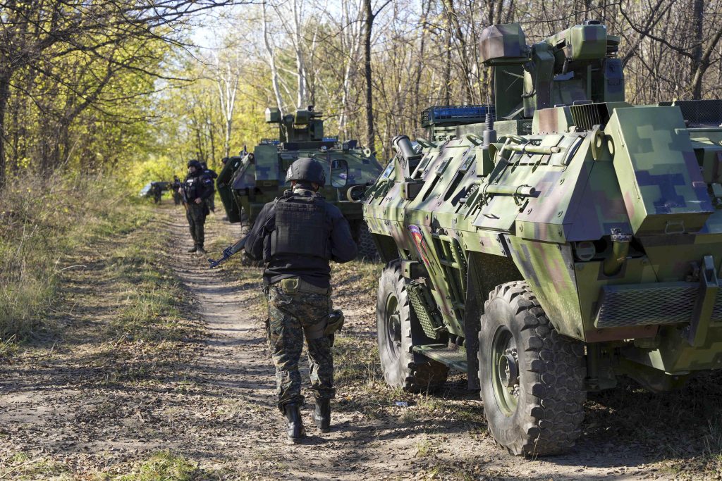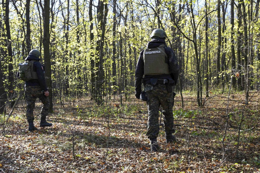 In this photo provided by the Serbian Interior Ministry, Serbian gendarmerie officers looking for migrants in a forest near the border between Serbia and Hungary, Serbia, Thursday, Nov. 2, 2023. Serbian police said Friday, Nov. 3, 2023 they made seven arrests on suspicion of smuggling people into Hungary as part of a days-long crackdown on irregular migration in the wake of a shooting last week in the border area that killed three migrants and wounded one. Reports of violence and gun battles have become common near the border between Serbia and Hungary, a European Union member state.