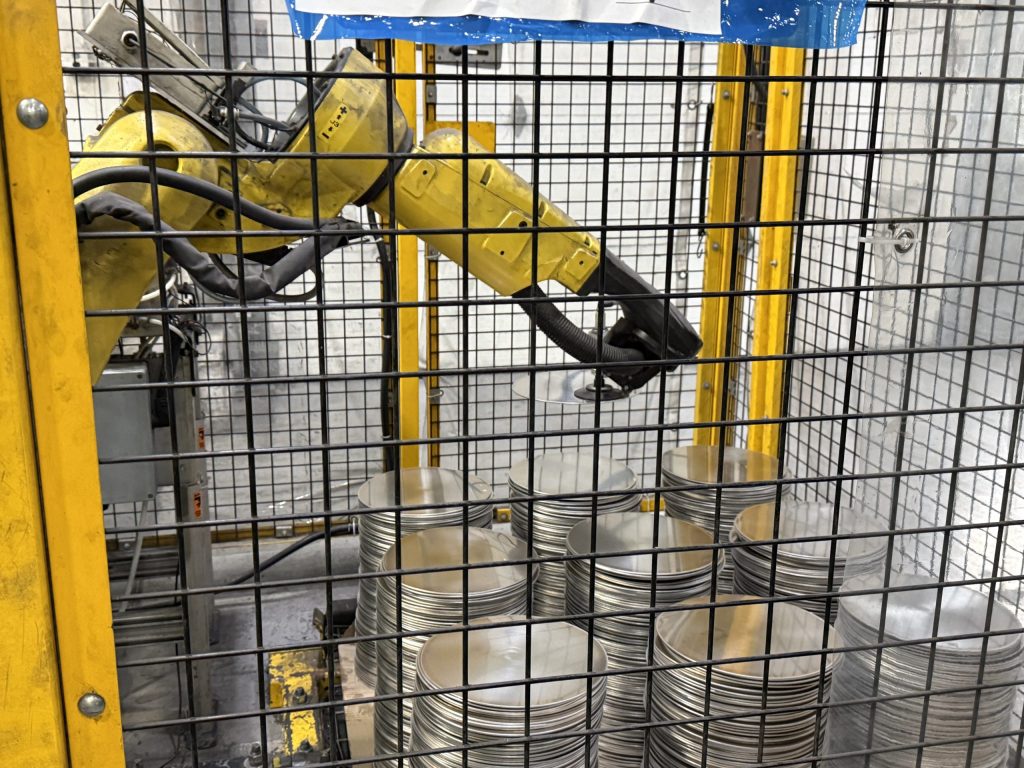 After the metal is heated, cooled, reheated and cooled again in the rolling mills, it is cut into discs, and a machine will shape those discs into a pot or pan.
