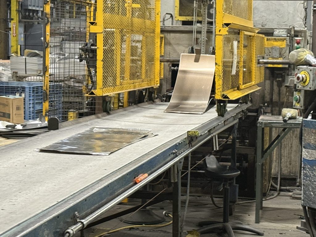 Inside the factory, large coils of metal are flattened and cut into smaller rectangles. Those smaller pieces are fed through a machine that grinds the surface to prepare them for bonding.