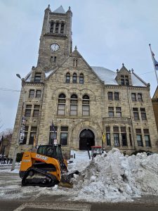A skid-loader pushes snow from the shoulder of East Main Street in front of the Fayette County Courthouse in Uniontown and piles it up to give motorists more room to navigate through the city Wednesday. Uniontown officials declared a state of emergency following Sunday’s winter storm that ...