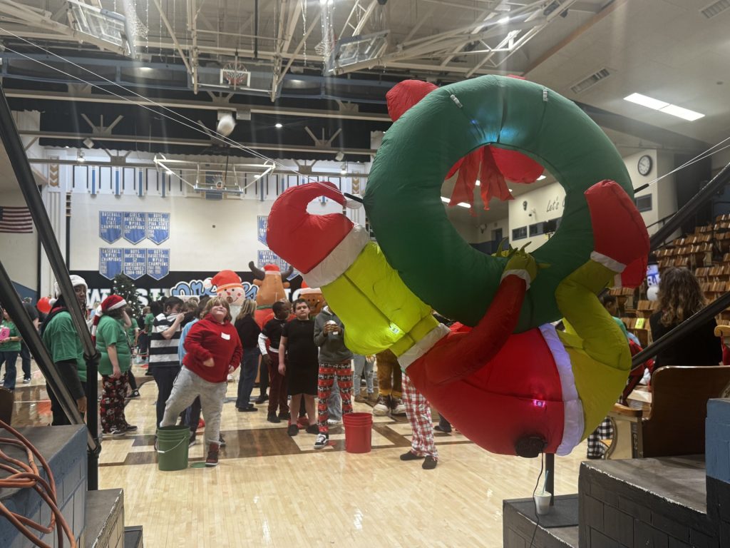 And they did have fun. In all, the students rotated through 22 games 鈥 throwing snowballs through a Grinch target, playing a relay game where they used giant candy canes to pass along a large inflatable Christmas ornament, stacking cups, racing inflatable reindeers around cones, and more 鈥 while Christmas tunes played and Mr. and Mrs. Claus made an appearance.